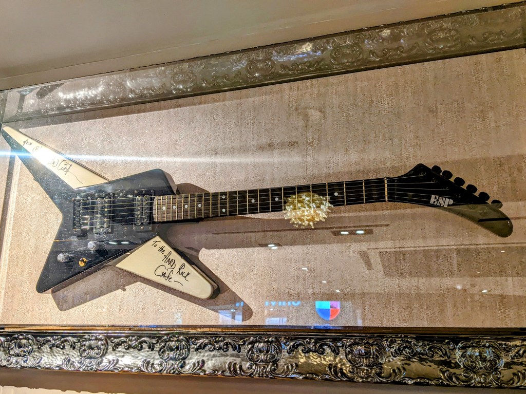 Recently I was passing through the Houston Airport, and I stopped at its Hard Rock Cafe for lunch and some “rock relic” gazing. They had a guitar on the wall from Blue Oyster Cult, and I was immediately reminded of “Godzilla” which is my favorite BOC tune for its lyrics as well as its searing solo riffs. Anyway, I snapped a quick picture of the guitar, and it now makes me think of today’s saint, Athanasius (sometimes referred to as “the Great”) who died on this date in 373, and who is famous for many things, but especially affirming courageously the divinity of Christ contra mundum (against the whole world) which had swallowed whole the Arian Heresy denying the divinity of Christ, even though the Council of Nicea in 325 declared it. Strange times indeed!