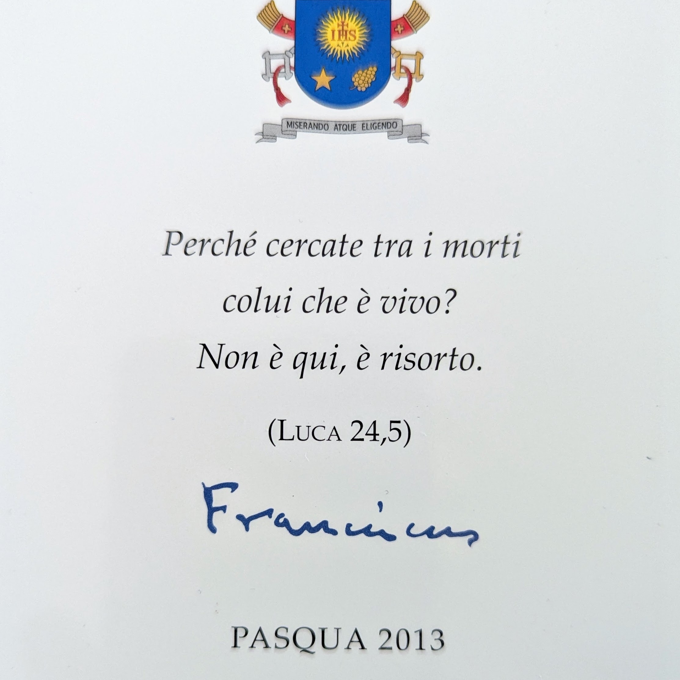 Pictured above is an Easter card I received from Pope Francis (R.I.P.) in 2013, the first Easter of his lengthy pontificate and now a chapter of history. The Resurrection of Jesus Christ triumphant over suffering and death is, in the words of St. Paul, “of first importance” (1 Cor 15:4) in our life of faith. I particularly like the card’s angel quote from Saint Luke’s gospel: “Why do you look among the dead for him who lives? He is not here; He is Risen.” As the Western Hemisphere rose from sleep Easter Monday morning, and we heard the news that Pope Francis had died, these gospel words soon came into my mind. It seems to me that God, in His Providence, allowed Pope Francis a special share in the Easter Mystery by refocusing the very end of his pontificate on the Lord’s Resurrection. The Pope’s death occurred within the Easter Octave (eight days of celebration) when no Masses other than Easter Masses, can be celebrated (the only exception being a funeral Mass, which for Pope Francis, takes place Easter Saturday). So, while we mourn the loss of the Holy Father (and will continue to do so for nine days after his funeral, leading to the election of Pope number 267) the joy of the Easter Season mystically triumphs over grief.